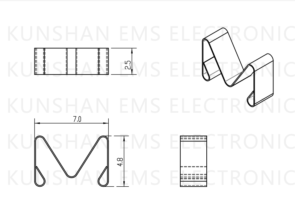 SMD-M-01704825的長度為4.8mm,寬度為2.5mm,高度為7.0mm,為了保證其在自動化生產(chǎn)中不容易傾倒,設計中加大了兩端的重量,經(jīng)自動化生產(chǎn)驗證,該簧片自動化生產(chǎn)非常可靠。由于簧片本身“瘦高”,本身的強度也需要經(jīng)過嚴格的機械強度仿真,特別考驗加工廠的加工處理能力,綜合下來才能保證其機械強度。采用了高強度鈹銅,保證了其電導率,使之具備較強的載流能力,適合電流較大的應用。而電子水泵通常具有較大的電流,SMD-M-01704825是很好的選擇。
