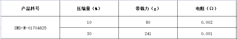在應用SMD-M-01704825進行接地處理時,一定要保證合適合適的壓縮比,因為壓縮比直接關系到其接觸電阻,一般情況下,簧片需要壓縮(10~30)%,這樣其阻抗值最低打1mΩ,基本可以忽略。保證其可靠接觸的指標是帶載強度,在壓縮10%時,達到80g,在壓縮30%時,高達241g,能夠充分滿足運動或震動時,電路板與地平面的充分接觸。而作為電子水泵應用,其時刻處于震動和運動中,連接中不允許出現(xiàn)中斷,這也是工程師選擇SMD-M-01704825最主要的原因,其彈性、帶載強度、接觸電阻指標如下圖所示。
