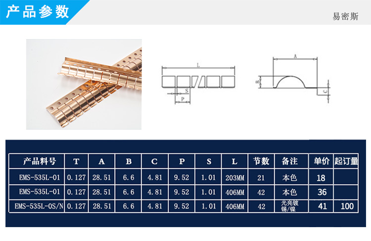EMS易密斯,2009年創立于昆山,主要產品為EMI鈹銅簧片、不銹鋼彈片、導電泡棉和其他配套電子材料,是目前華東最具規模、產品最齊全的民用電子設備EMI電磁干擾屏蔽材料解決方案提供商。