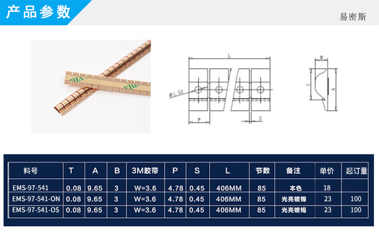 EMS易密斯,2009年創立于昆山,主要產品為EMI鈹銅簧片、不銹鋼彈片、導電泡棉和其他配套電子材料,是目前華東最具規模、產品最齊全的民用電子設備EMI電磁干擾屏蔽材料解決方案提供商。