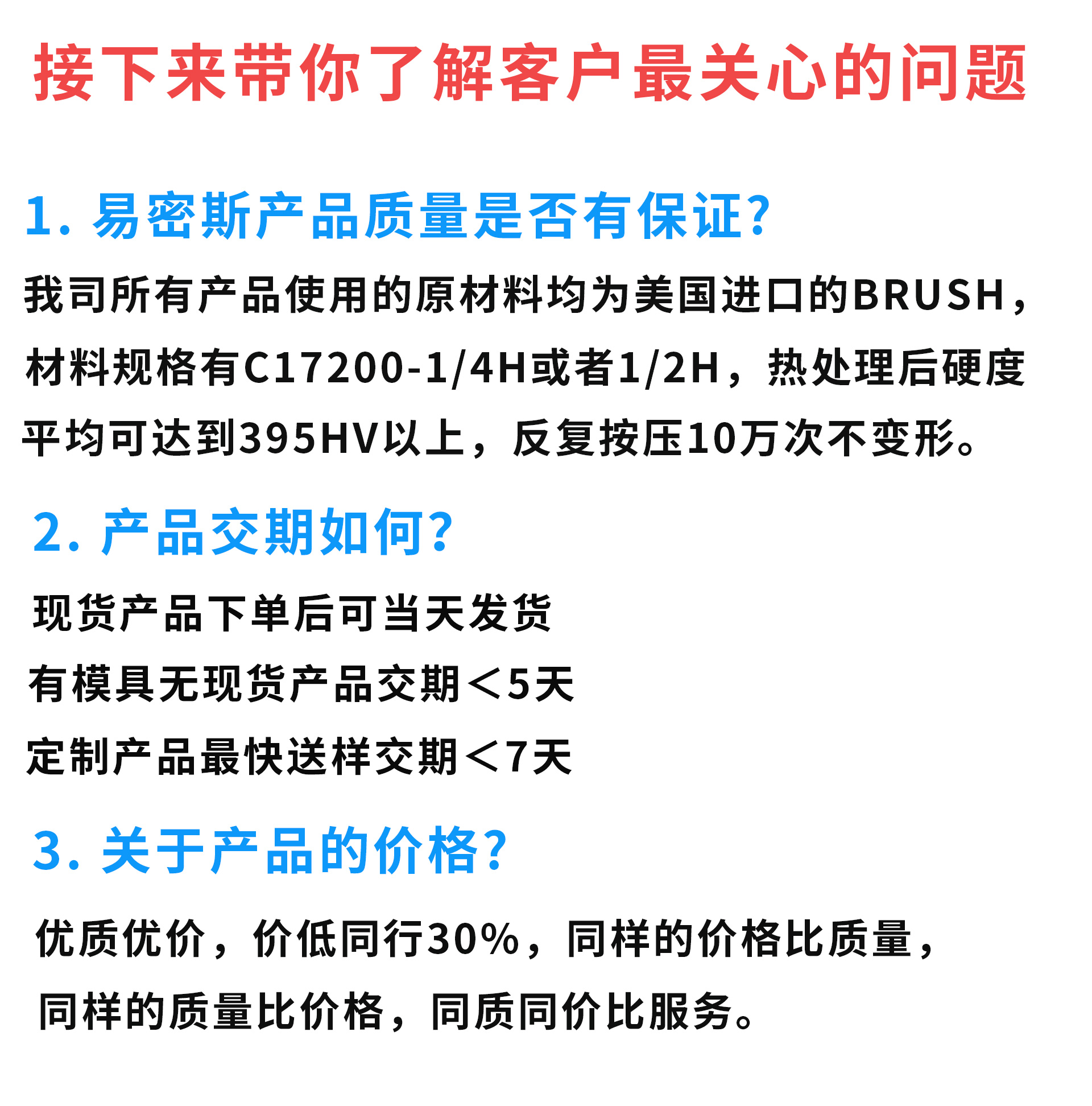 所以當網友們購買這個鈹銅彈片,考慮價格無可厚非,但是不能說將這個鈹銅彈片的價格作為評定標準,網友們同時還需要考慮到這個鈹銅簧片的質量,售后等等情況。這樣才能購買到好的鈹銅簧片
