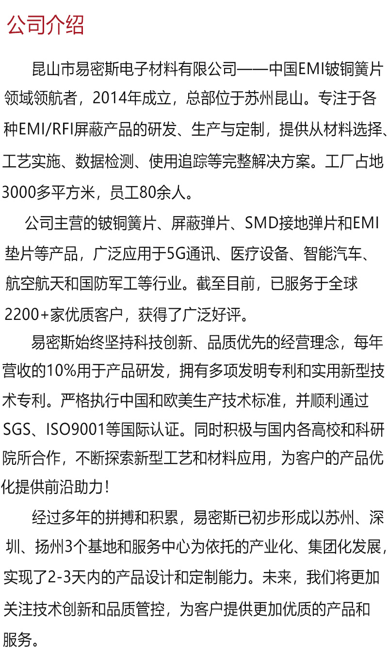 江浙滬汽車電子彈片多少錢,一款好的鈹銅彈片,不僅要具有價格優(yōu)勢,同時要能滿足廠家對質(zhì)量和屏蔽效能的需求,所以江浙滬的朋友在考慮鈹銅彈片多少錢的同時,更要注重所采購的電子彈片質(zhì)量的穩(wěn)定性。易密斯鈹銅彈片作為國內(nèi)電磁屏簧片行業(yè)翹楚者,有著10年以上工廠經(jīng)驗和全套進(jìn)口生產(chǎn)設(shè)備,產(chǎn)品已通過ISO9001質(zhì)量體系認(rèn)證。已成功為眾多上市企業(yè)提供了優(yōu)良產(chǎn)品和貼心服務(wù)。